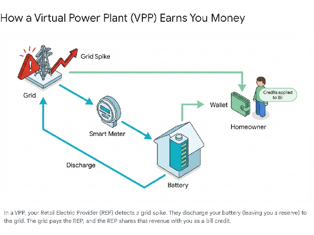 Homeowners grant permission for a third party (like an aggregator or REP) to control their battery during specific "grid events"—moments when demand is critically high (e.g., a summer heatwave).