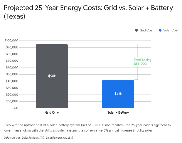 - Property Taxes are Protected: Texas law prevents county appraisal districts from increasing a home's taxable value due to the installation of solar or wind energy devices. Homeowners retain 100% of the equity gain tax‑free.2